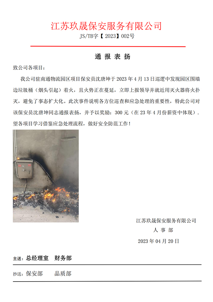 We hereby commend Comrade Shen Tangkun, the security guard, and award him a reward of 300 yuan. I hope all project staff can learn from his emergency response process and flexibly apply it to their work, and do a good job in safety prevention!