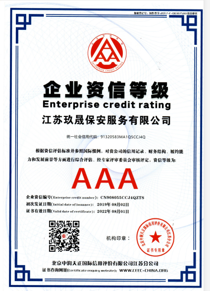 在昆山保安公司全體員工的團結協作、共同努力下,玖晟保安公司順利通過信用等級AAA證書資質審核。、