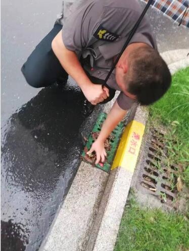 于是保安人員開始疏通下水道,徒手把堵住井蓋的落葉撈出。而此時,過往的車輛也在保安員的提醒下,降低車速,防止積水濺到行人身上。我們的保安員一直到路面完全恢復正常后,才離開繼續投入到自己的工作中。