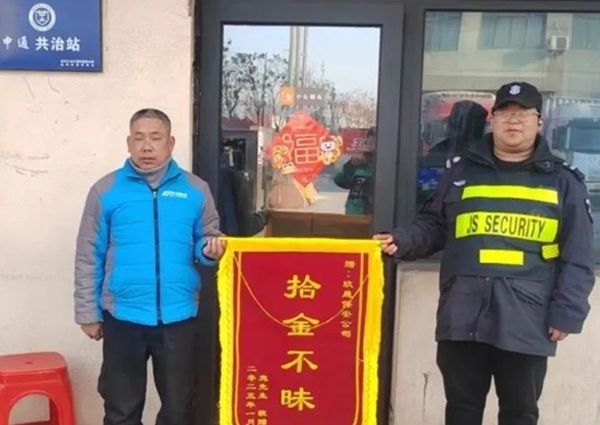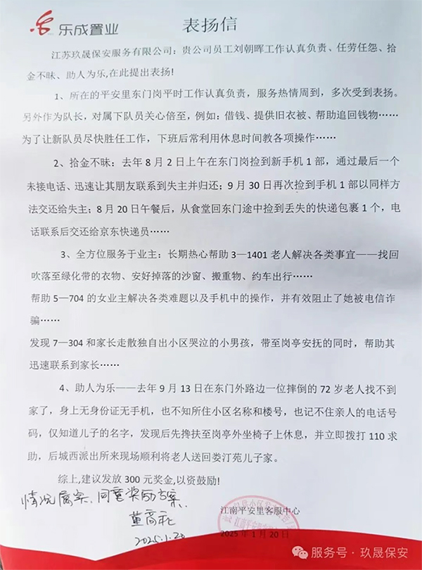 在樂成平安里項目,江蘇玖晟保安公司的保安員們堅守崗位,用善舉贏得客戶贊譽。他們多次拾金不昧,撿到貴重物品后,第一時間妥善保管,將物品歸還失主,彰顯高尚品德。此外,他們還熱心助人幫助摔倒的老人送至回家。
