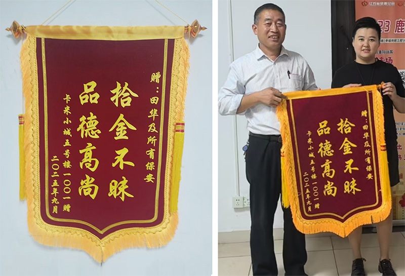 一面錦旗,一份認可!近日,花橋綠地雅苑的業主張女士,專程送來一面滿載感謝的錦旗,這份特殊的心意,源于一場溫暖的拾金不昧之舉。